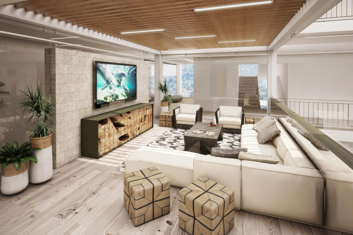 The loft is located on the Roof Garden level, the same floor as the pool—perfect for enjoying the best views and relaxing atmosphere 🌅. The living and dining area includes a TV 📺, and the fully equipped kitchen 🍳 has everything you need to prepare your favorite meals.