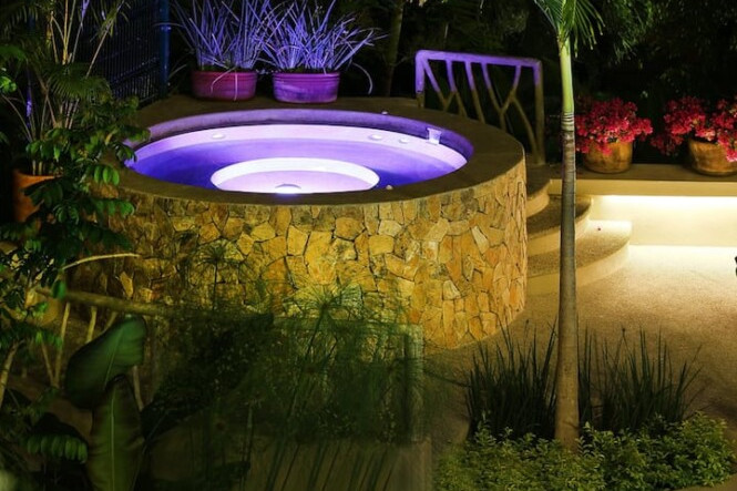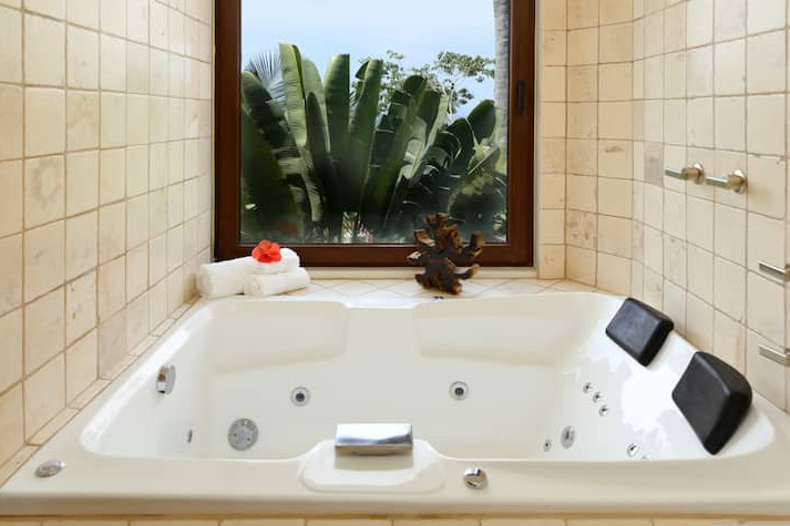 Guests share access to the lush tropical grounds and a large saltwater pool surrounded by serene lounging areas.