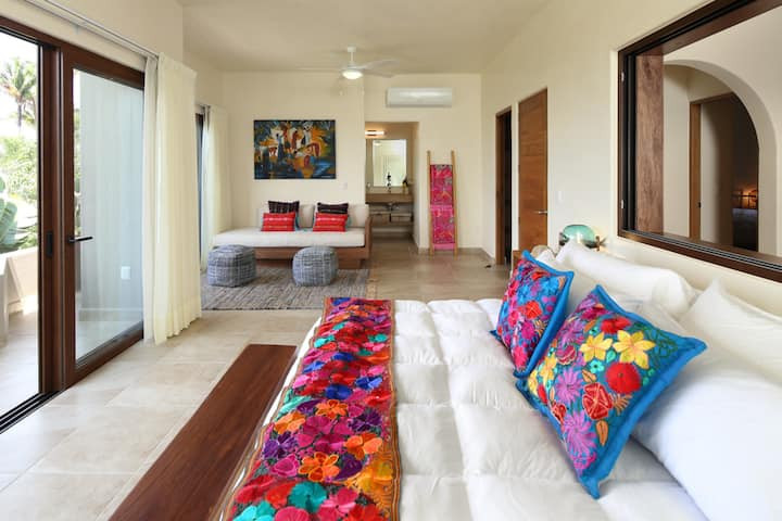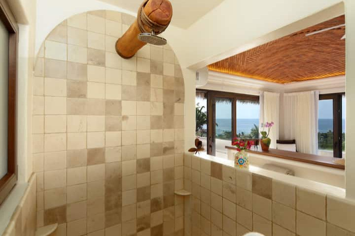 The Penthouse showcases a soaring palapa roof, a fully equipped kitchen, and open-concept living spaces with elegant sliding doors that invite the ocean breeze—or can be closed to enjoy air-conditioned comfort with panoramic ocean views. The master suite features a luxurious bathtub and rainfall shower for ultimate relaxation.