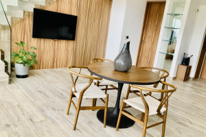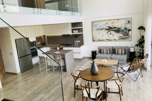 The loft is located on the Roof Garden level, the same floor as the pool—perfect for enjoying the best views and relaxing atmosphere 🌅. The living and dining area includes a TV 📺, and the fully equipped kitchen 🍳 has everything you need to prepare your favorite meals.